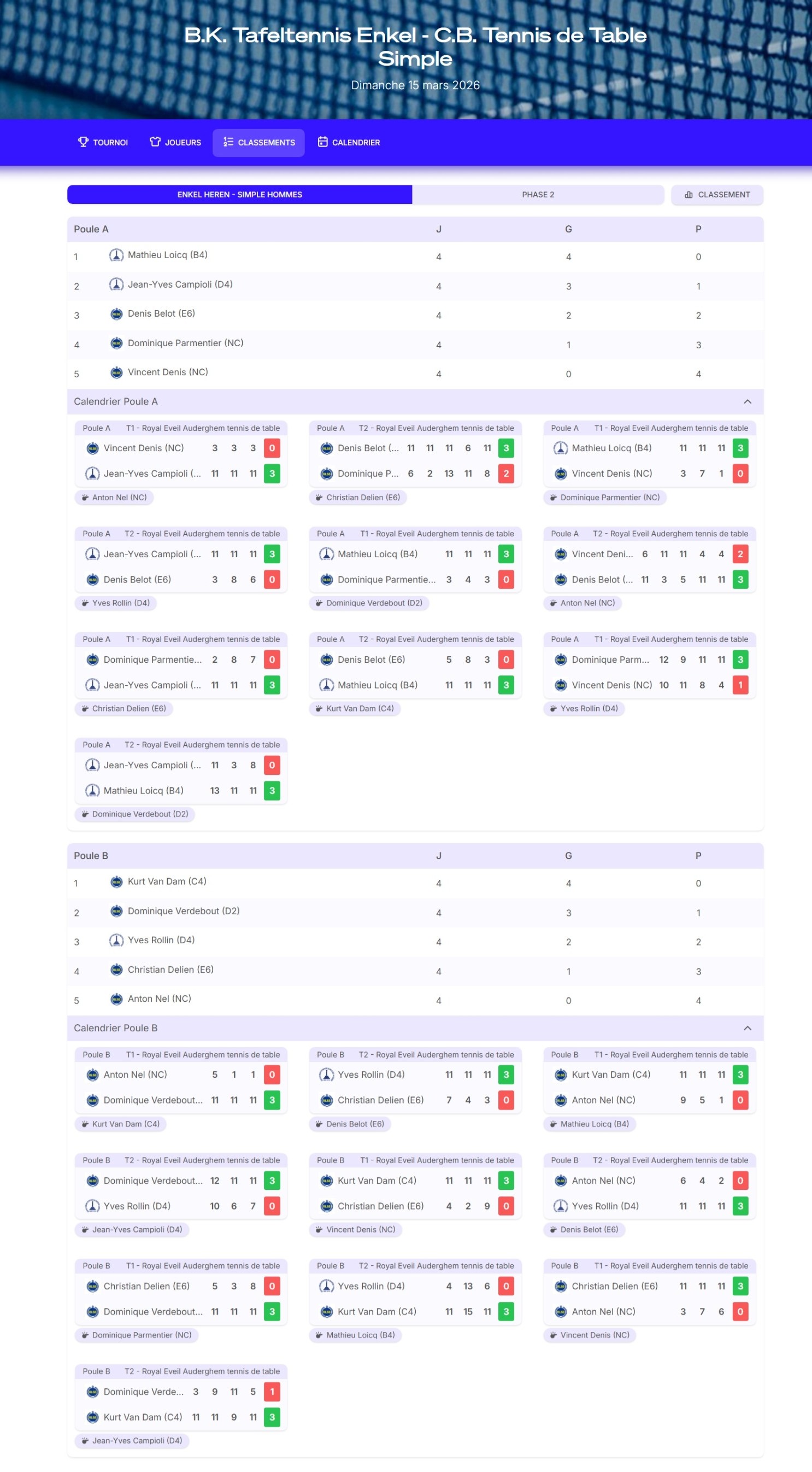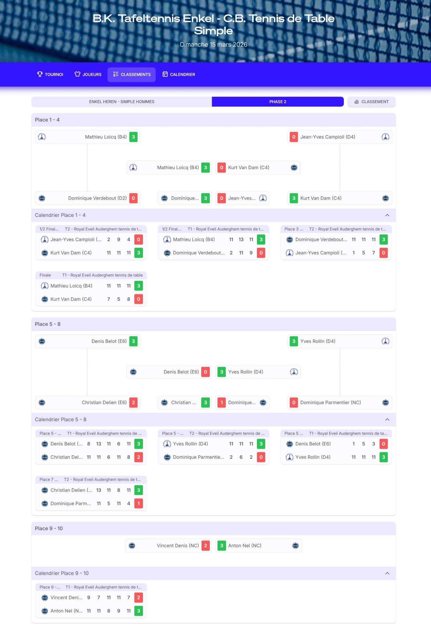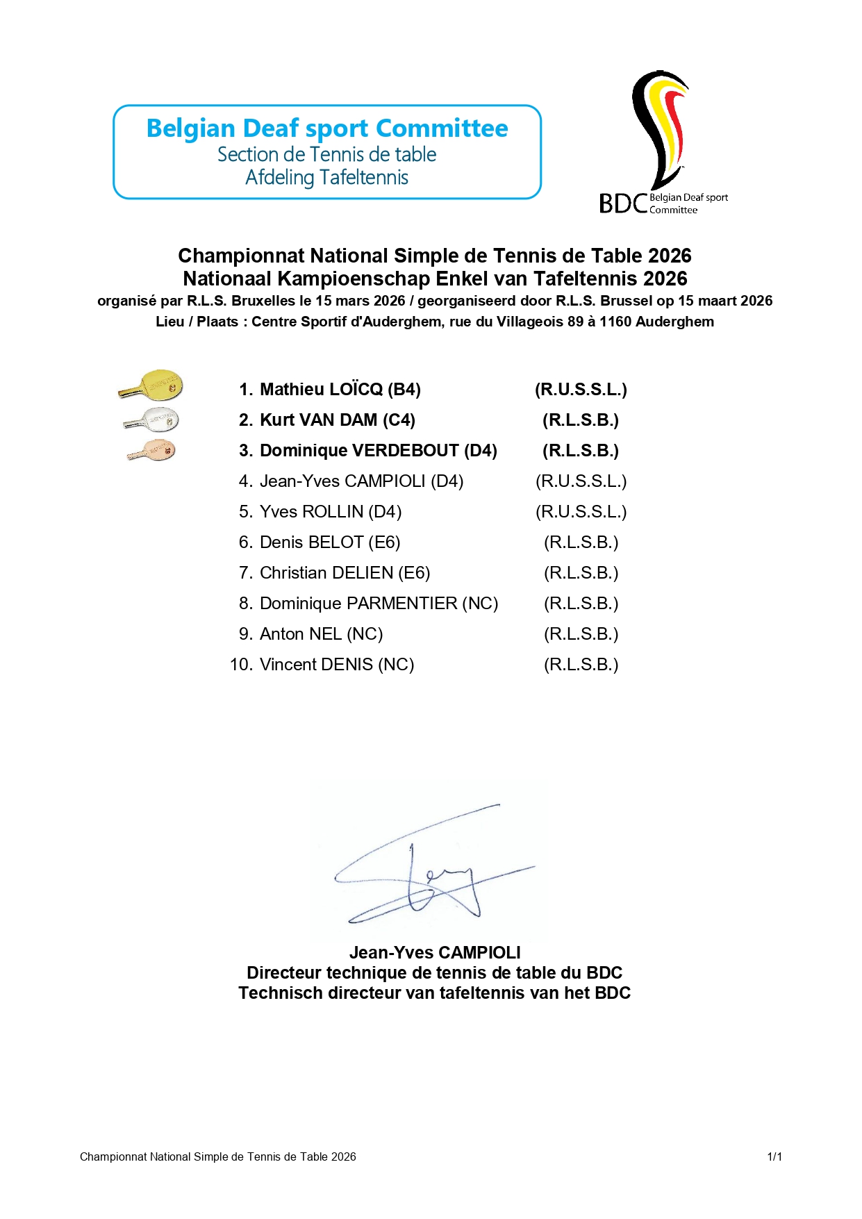 You will find the results and a photo of the 2026 National Table Tennis Singles Championship organized by R.L.S. Brussels this Sunday, March 15, 2026, in Auderghem.